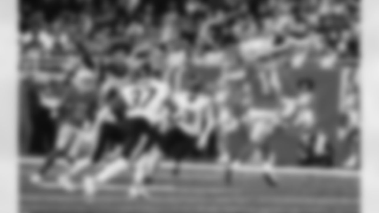 Detroit Lions defensive lineman Aidan Hutchinson (97) intercepts a pass during a NFL football game against the Chicago Bears on Sunday, January 1, 2023 in Detroit, MI. (Jeff Nguyen/Detroit Lions).